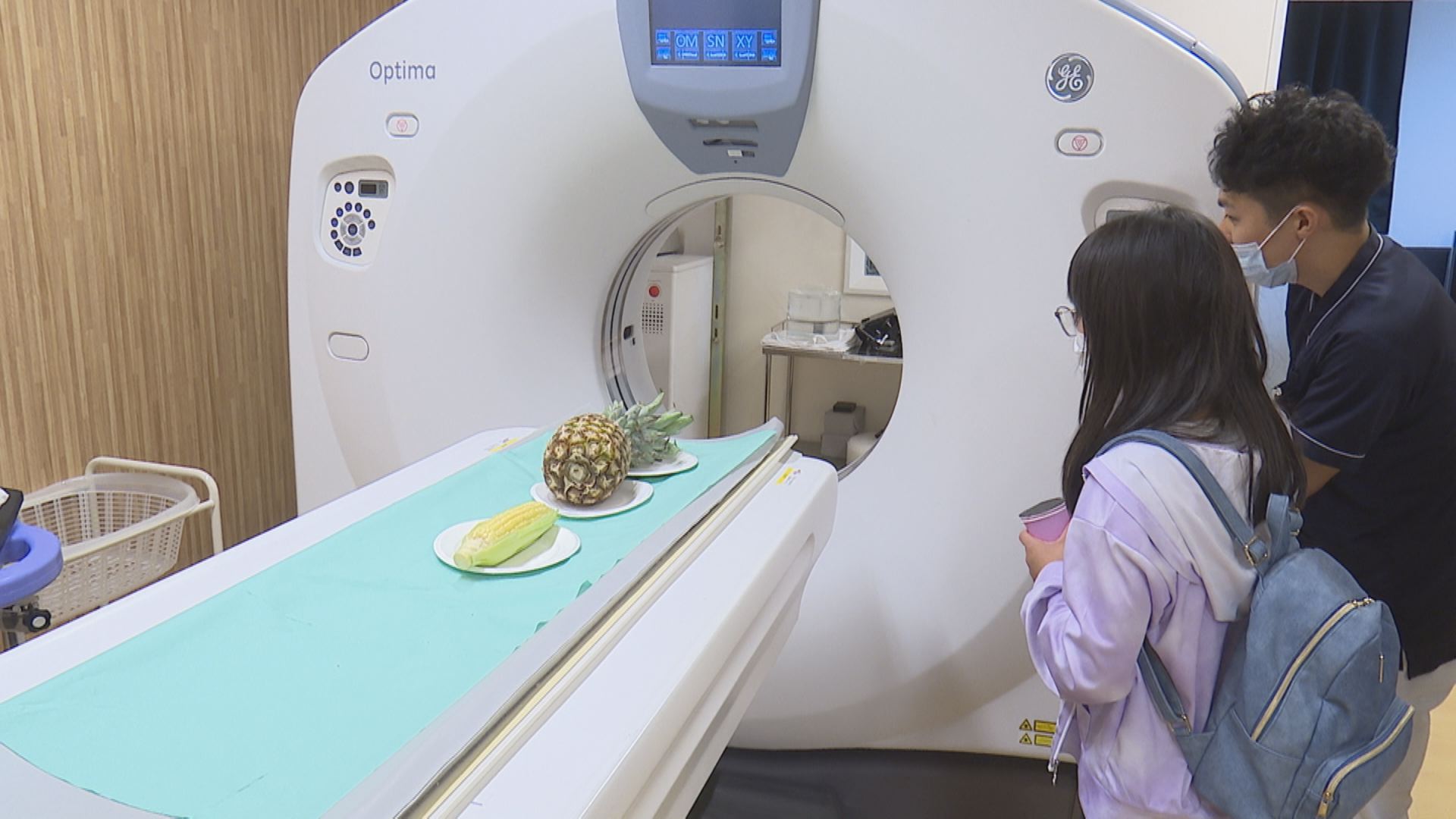 「放射線科」のコーナーでは、X線を利用して身体の断面像を撮影するCTと呼ばれる装置を見学。実際に装置を使って、パイナップルやトウモロコシなどを撮影し、断面を確認する体験が行われ、見学した人たちはその鮮明な画像に驚きながら、放射線技師の説明を興味深そうに聞いていました。