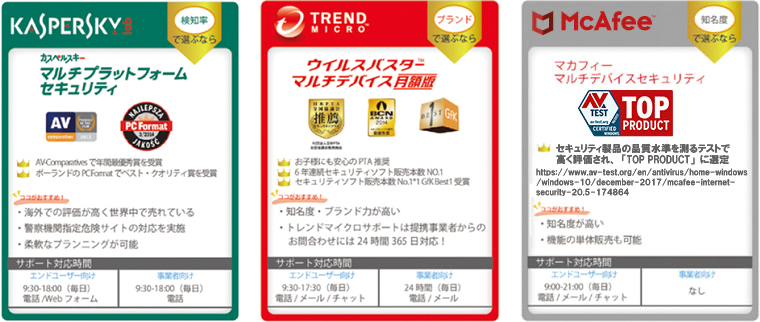 ウイルス対策ソフトはカスペルスキー、トレンドマイクロ、マカフィーの3種をご用意しております。